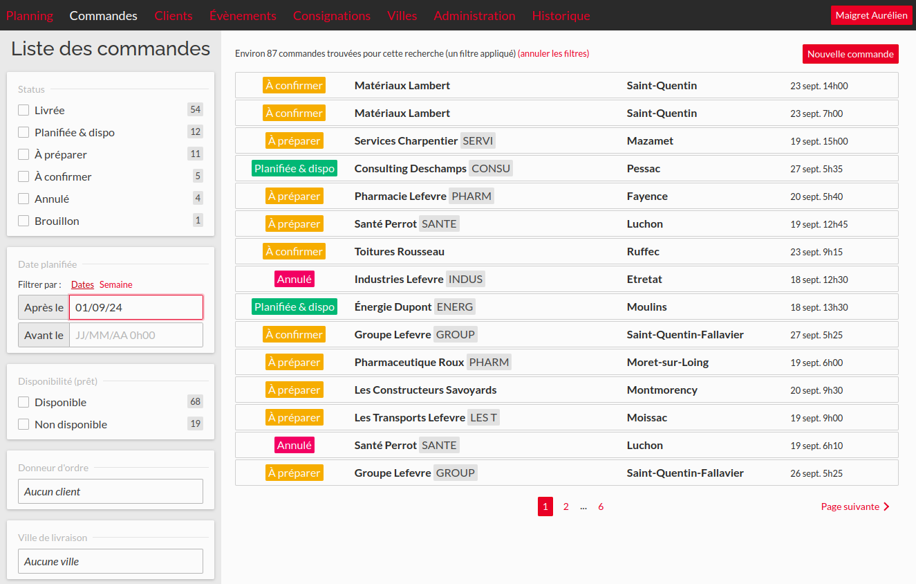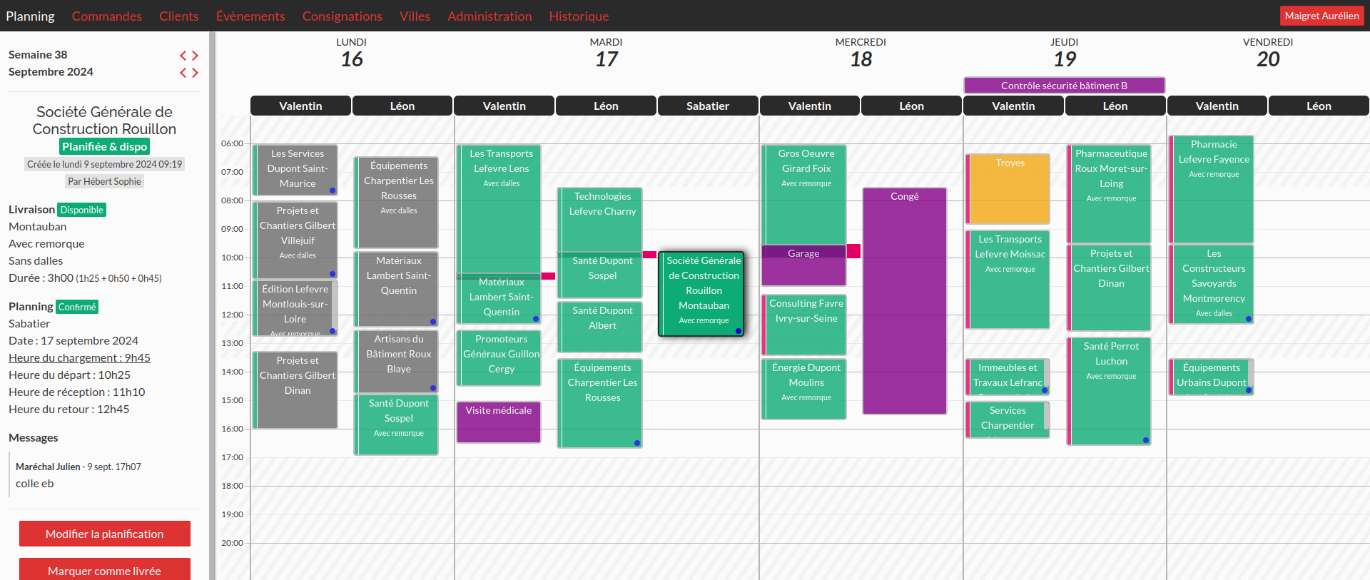 Chaque commande peut être associée à un client, inclure des détails de chargement, des préférences spécifiques (horaires de livraison, etc.), des informations administratives telles que le numéro de facture, ou des consignes de chantier (récupérer un chèque de caution, etc.).