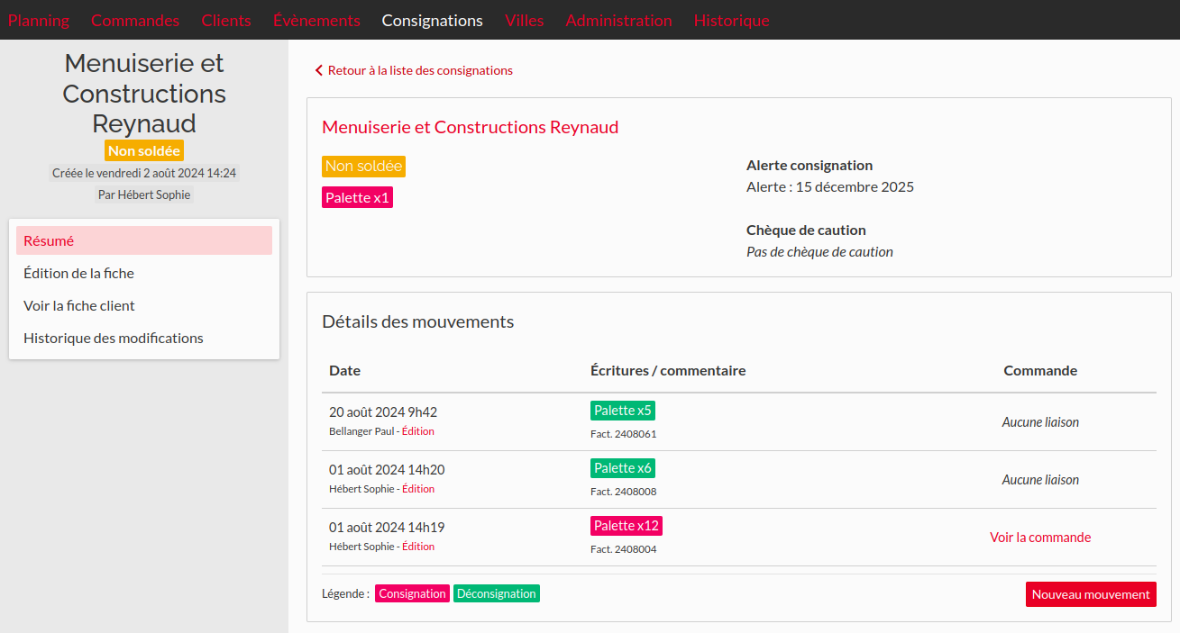 Des consignations, telles que des palettes, peuvent être associées à vos commandes. Gérez les mouvements de consignation, les chèques de caution, et recevez des rappels automatiques pour les consignations non soldées.